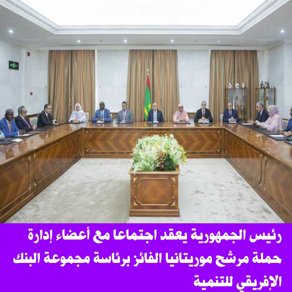 عقد رئيس الجمهورية، السيد محمد ولد الشيخ الغزواني، اليوم الجمعة، اجتماعًا بالقصر الرئاسي في نواكشوط، مع أعضاء إدارة حملة مرشح موريتانيا الفائز برئاسة مجموعة البنك الإفريقي للتنمية، السيد سيدي ولد التاه.