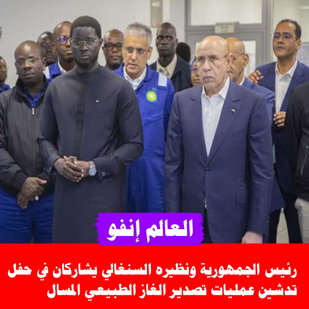 شارك رئيس الجمهورية السيد محمد ولد الشيخ الغزواني، اليوم الخميس، رفقة نظيره السنغالي فخامة الرئيس باسيرو ديوماي فاي، من المنصة العائمة لتسييل الغاز الطبيعي FLNG، بمنطقة حقل الغاز السلحفاة آحميم الكبير بعرض البحر، في حفل تدشين عمليات تصدير الغاز الطبيعي المسال (LNG) الذي بدأ منذ أبريل الماضي.