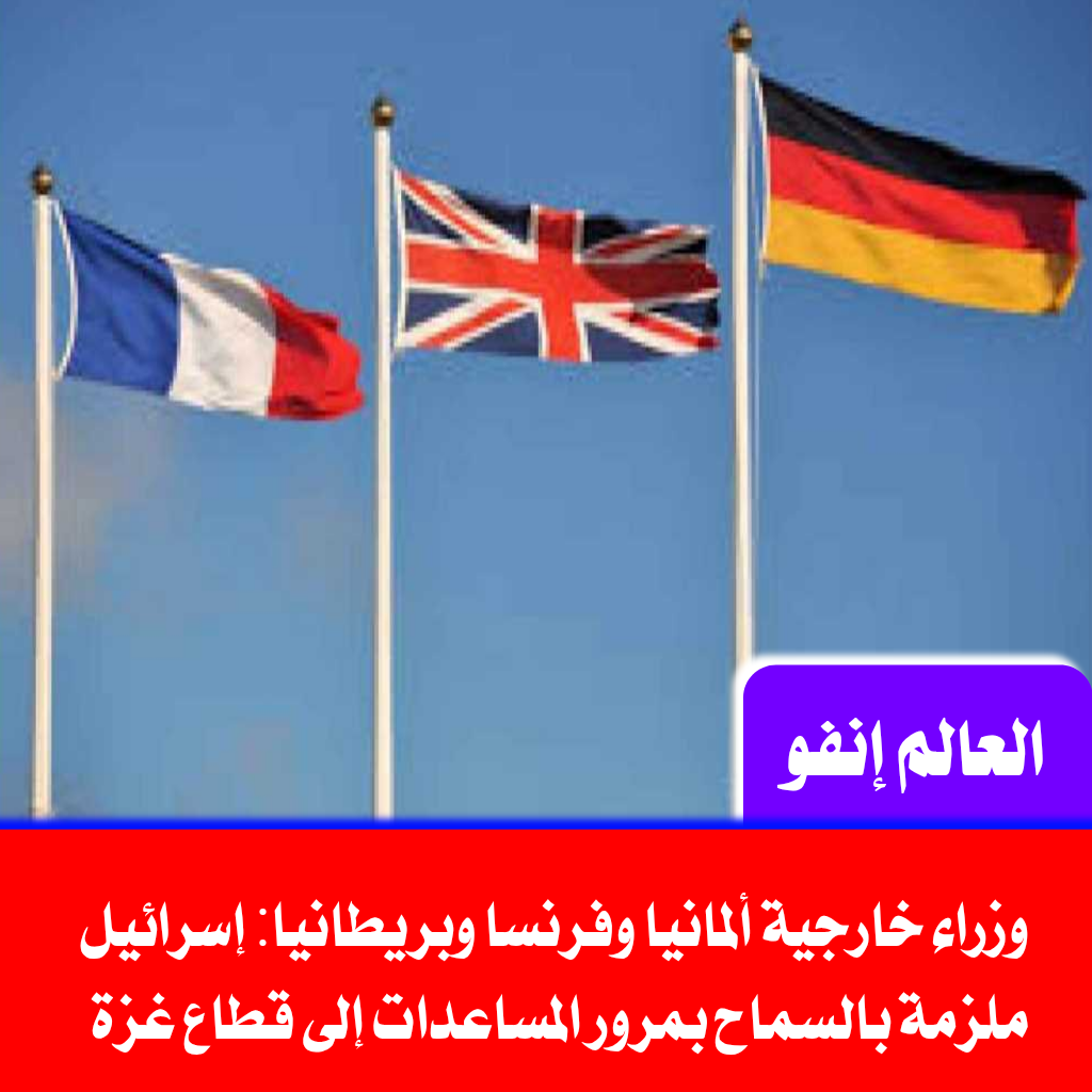 قال وزراء خارجية ألمانيا وفرنسا وبريطانيا، في بيان مشترك اليوم الأربعاء، إن إسرائيل ملزمة بموجب القانون الدولي بالسماح بمرور المساعدات إلى قطاع غزة دون عوائق.