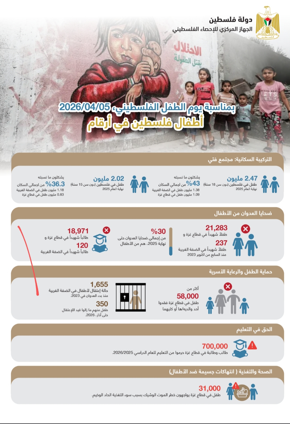كشفت بيانات ديموغرافية حديثة أن عدد سكان دولة فلسطين بلغ نحو 5.56 مليون نسمة مع نهاية العام 2025، يشكل الأطفال نسبة كبيرة منهم، في مؤشر واضح على طبيعة المجتم