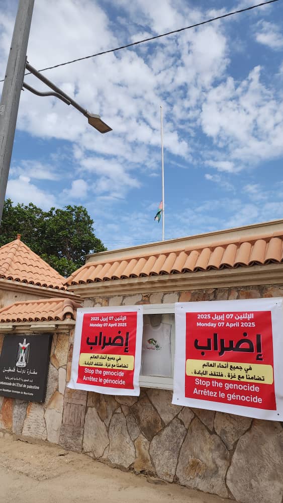وعلقت سفارة دولة فلسطين في موريتانيا لافتات الإضراب على واجهة مبنى السفارة في تفرغ زينه كما ظهر العلم الفلسطيني منكسا بفعل الاعداد المهولة للشهداء والمصابين جراء المحرقة التي يتعرض لها الشعب الفلسطيني الشقيق وخاصة في قطاع غزة المحاصر.