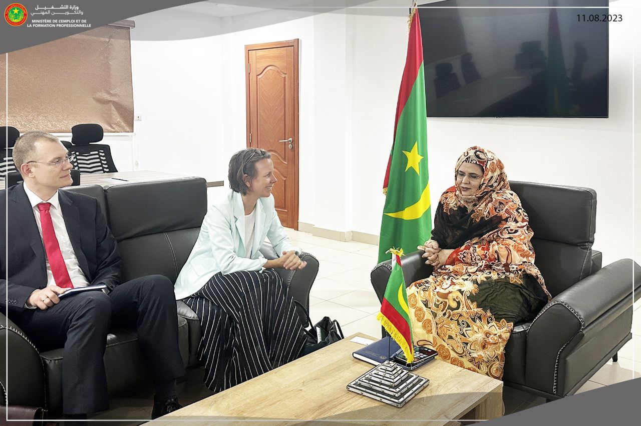 استقبلت وزيرة التشغيل والتكوين المهني، السيدة زينب بنت أحمدناه اليوم الجمعة بمكتبها في نواكشوط، سعادة سفيرة جمهورية ألمانيا الاتحادية، السيدة إيزابيل هنين رفقة الرئيس الجديد للتعاون السيد رينارد أوهليغ.